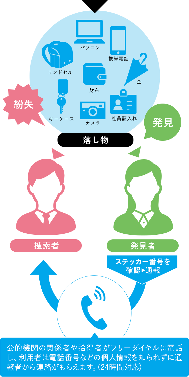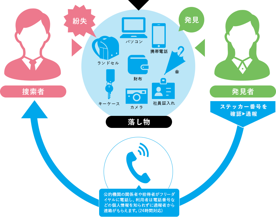 公的機関の関係者や拾得者がフリーダイヤルに電話し、音声案内に沿って10桁のIDを入力すると、利用者が予め登録した電話番号に自動転送されるシステムです。利用者は電話番号などの個人情報を知られずに通報者から連絡がもらえます。(24時間対応)