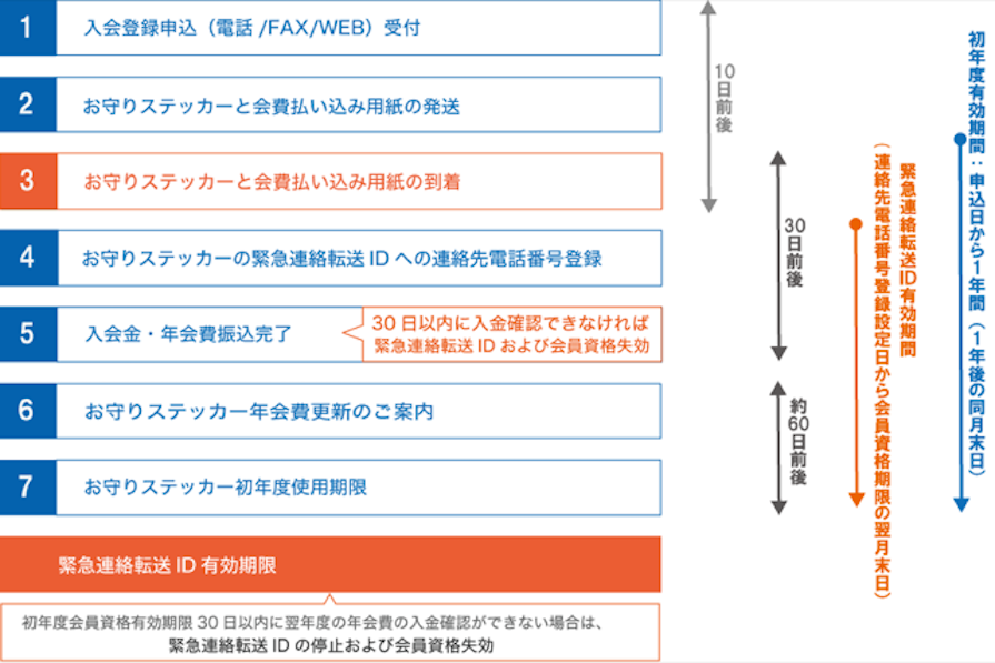 ただし、お守りステッカーの緊急連絡転送ID有効期間は、初期設定日から会員期間の終了日翌月末日の深夜0:00までとします。